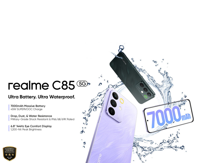 Dubbed as “Ultra Battery. Ultra Waterproof.,” the realme C85 5G delivers an exceptional combination of performance, endurance, and design, handling work, streaming, and social media apps with ease. Its reliability ensures the Squad stays productive and entertained throughout the day, while setting a new benchmark for durability and battery life in its class.