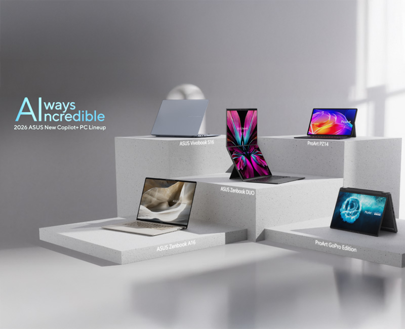 ASUS today showcased its all-new and award-winning 2026 lineup of AI-powered Copilot+ PCs at CES® 2026. These laptops and PCs are built to empower every creator, professional and everyday user. This comprehensive lineup boasts the latest Copilot+ PC experiences, exclusive ASUS AI apps, and the latest CPU platforms from AMD, Intel®, and Qualcomm® to ensure the best AI experiences.